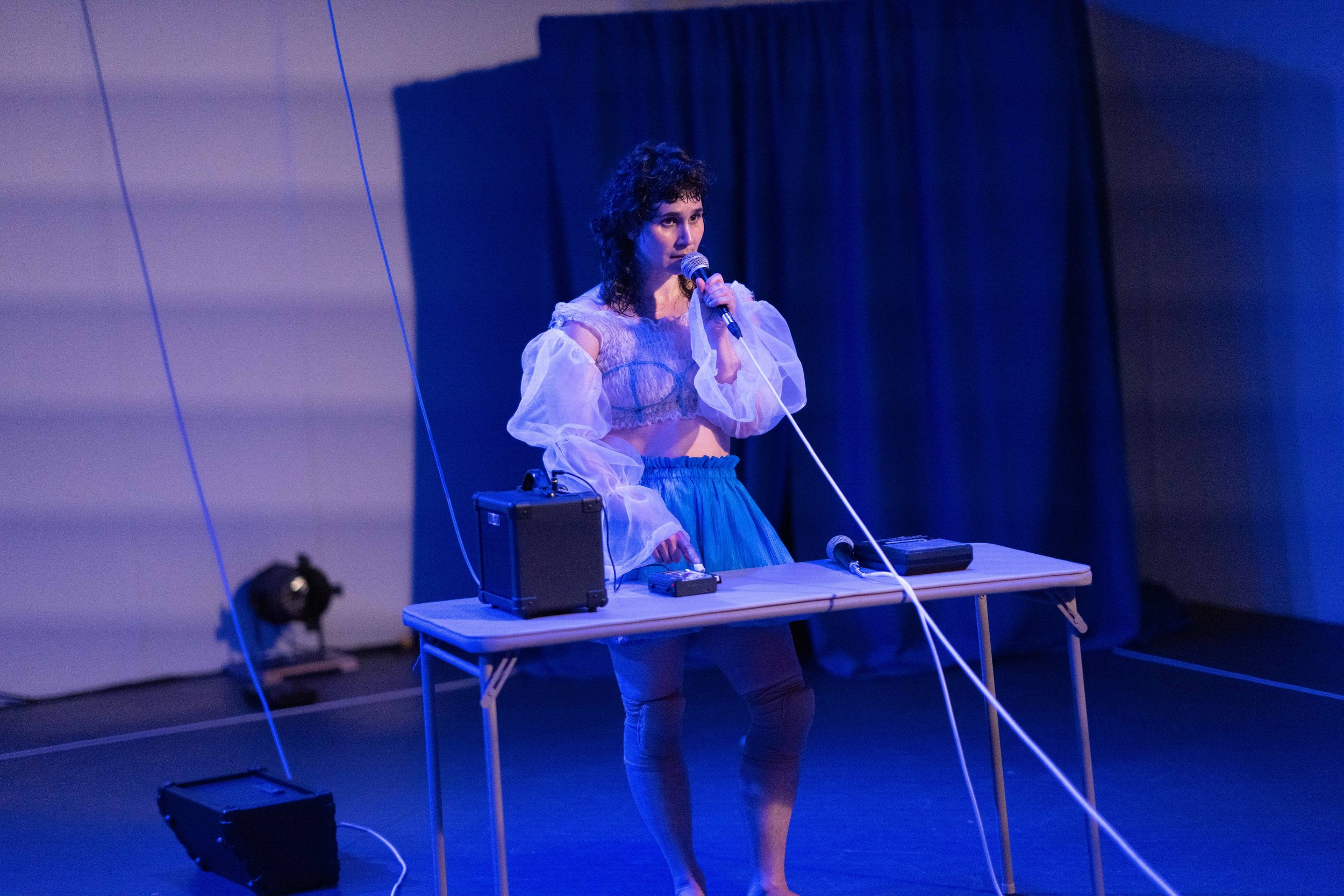 By My Own Hand, Part 4: MELODY is a solo work that engages the biomechanics of voice and an interweaving of movement, sound, and specter. Analog tape recorders with looping tapes generate unexpected rhythmic patterns, dense textures, and a wavering, imperfect chorus of voices. These sonic fragments are paired—and continually re-paired—with dances, gestures, and images, shaping a world of dissonance, entanglement, and transformation. As if intoning an elegy to her past selves, Allie conjures a space alive with poltergeist activity—dancing and singing within an intricate tapestry of wails, laughter, overtones, and unplaceable sounds. At once methodical and mundane, otherworldly and operatic, the work lives between elegy and manifesto, between haunted house and an architecture of alteration.